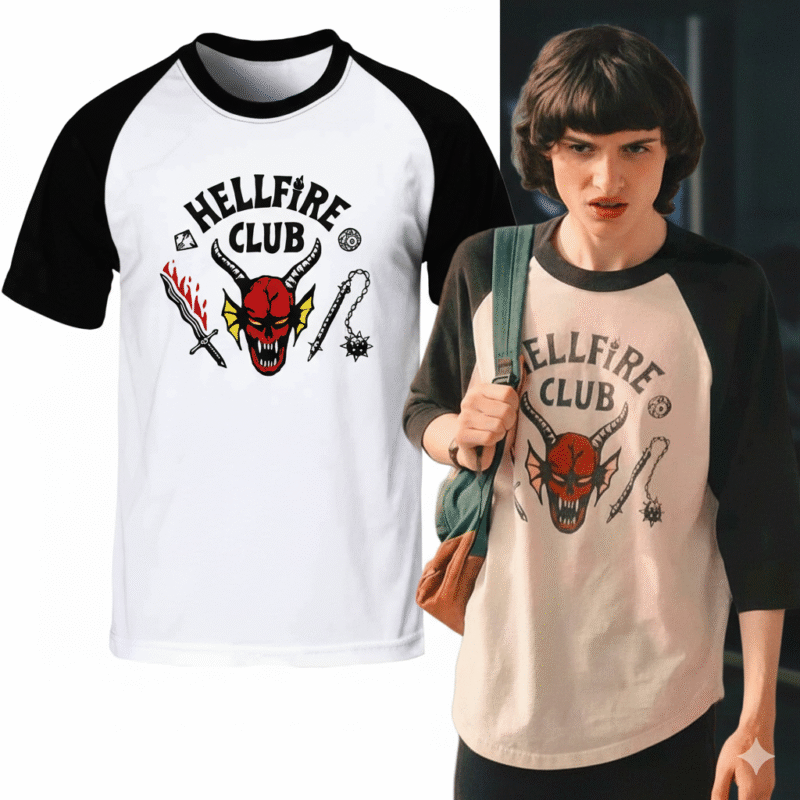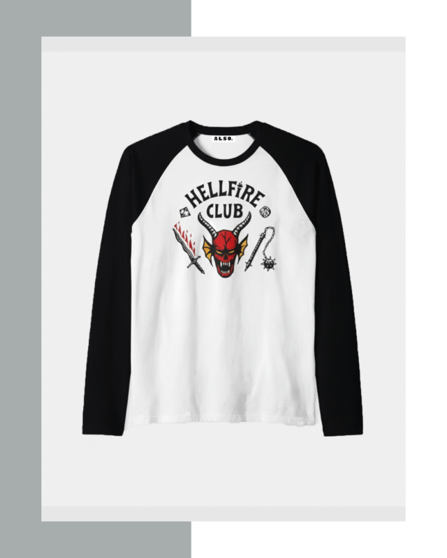 Unleash your inner Dungeon Master with The Hellfire Club Raglan Shirt, as seen on Eddie Munson in Stranger Things—because who doesn’t