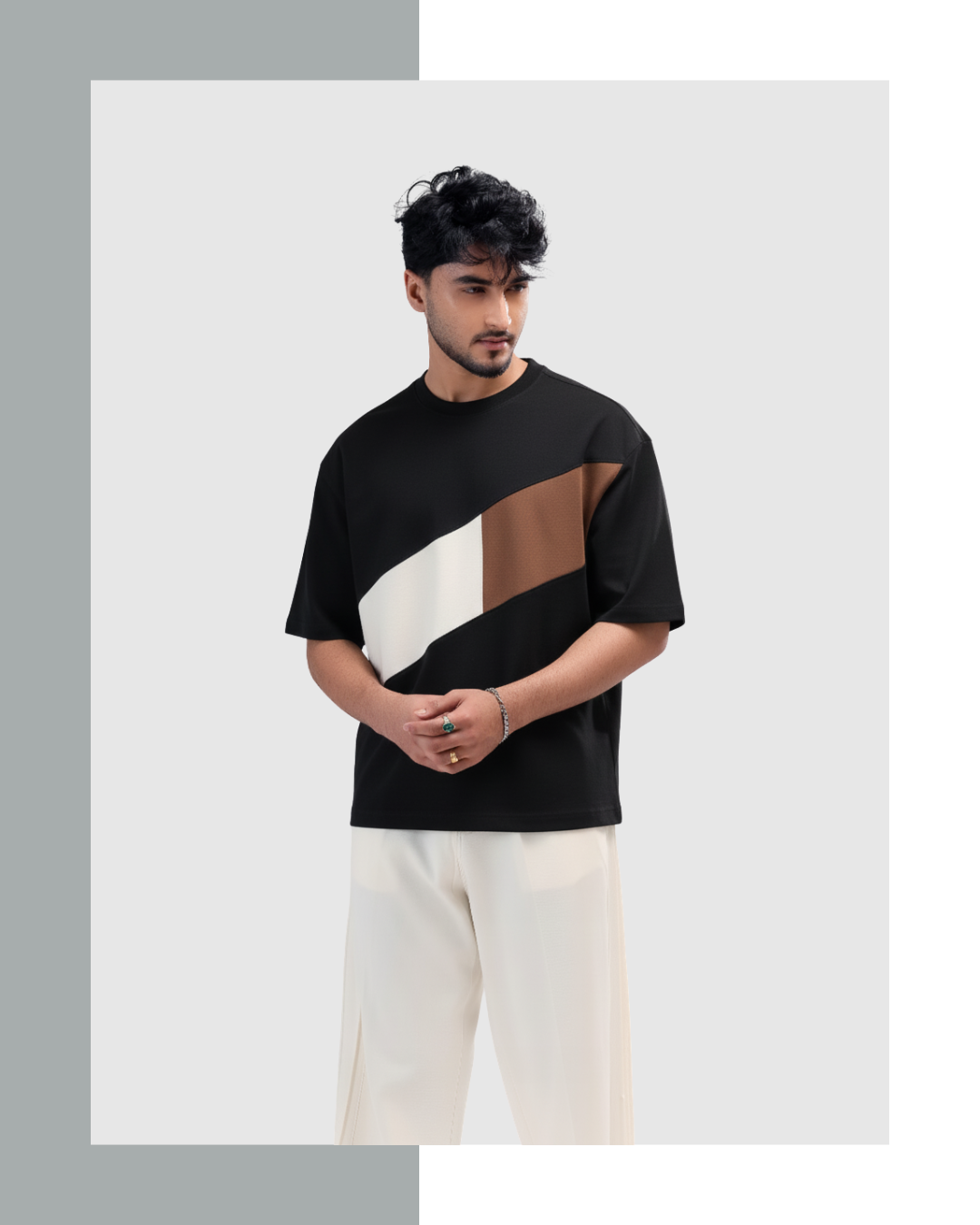 Black with White and Brown Contrast Premium Drop shoulder